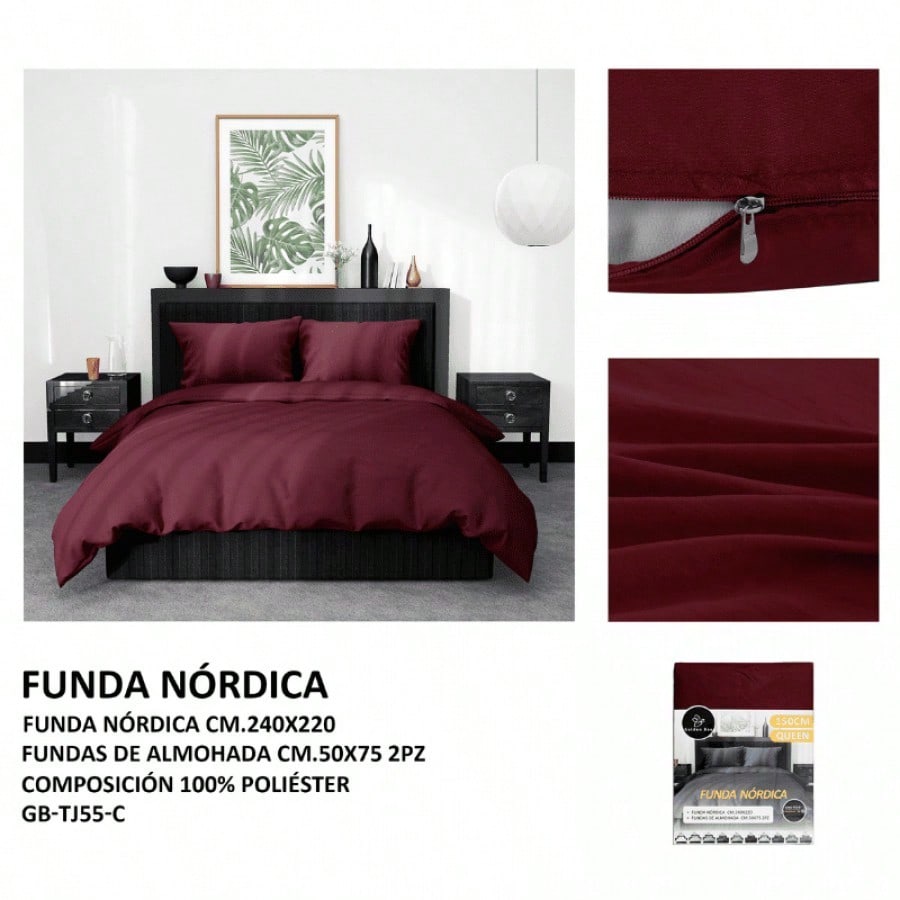 Este kit de funda nórdica monocromática, confeccionada en tela GB de un intenso color rojo vino, está diseñada para ofrecer una alta durabilidad y resistencia. Con dimensiones generosas de 240x220 cm, es ideal para edredones extragrandes, aportando un toque de lujo, calidez profunda y elegancia sofisticada a tu dormitorio. El tono envolvente y distinguido crea una atmósfera acogedora y con carácter, perfecta para integrarse en decoraciones clásicas o modernas con personalidad. La calidad del tejido garantiza suavidad, fácil mantenimiento y una larga vida útil, asegurando confort y un aspecto siempre majestuoso y refinado.