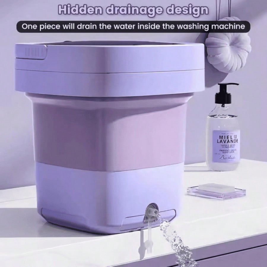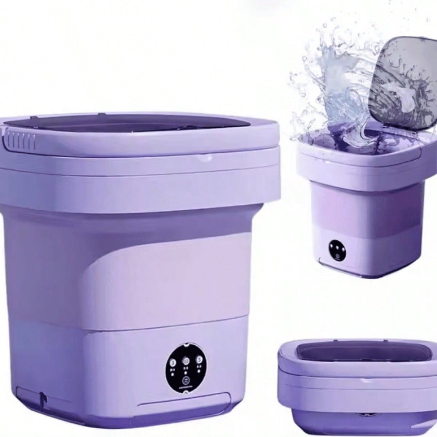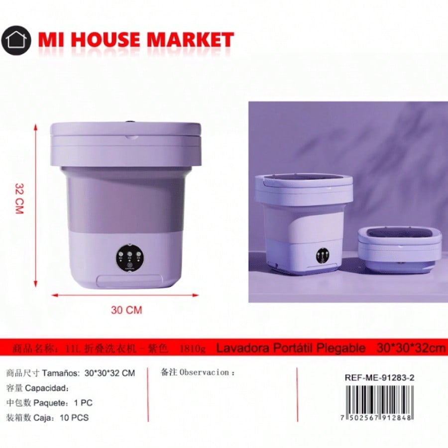 Lavadora plegable de 11 litros en color morado. Perfecta para lavados rápidos en espacios reducidos. Diseño compacto y plegable para fácil almacenamiento.