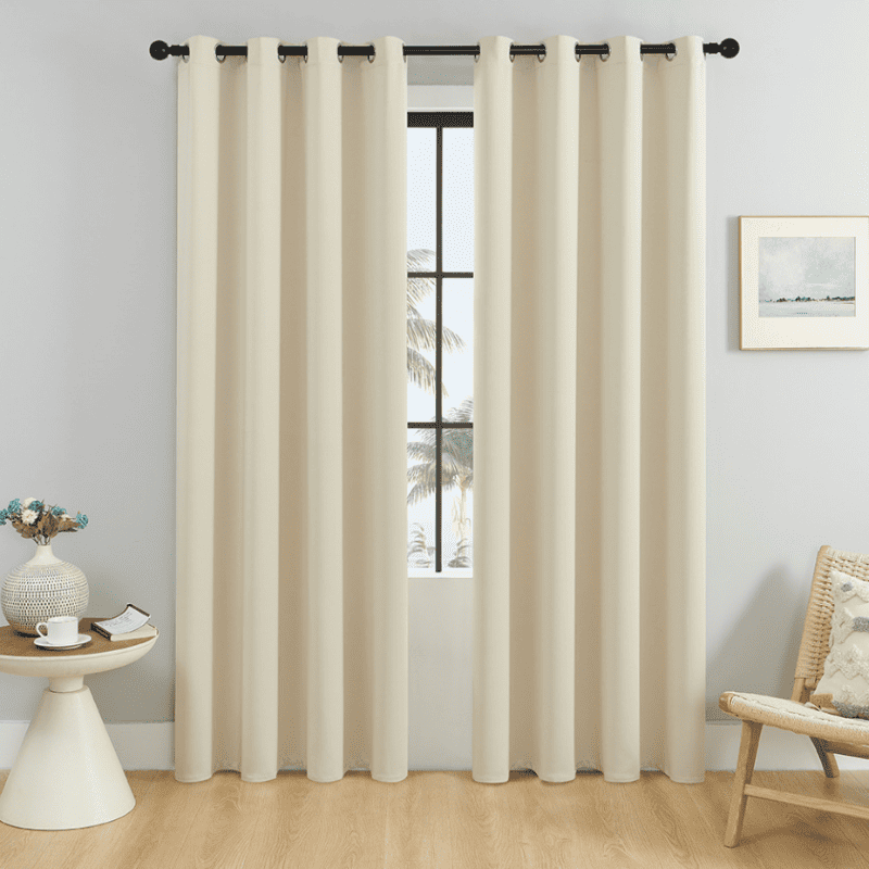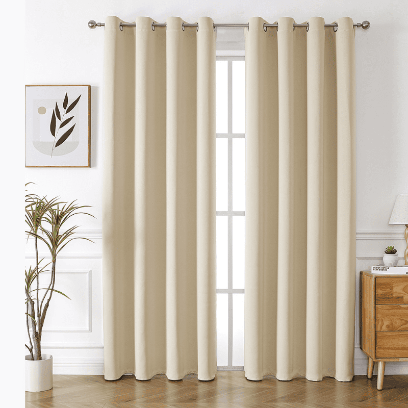 Cortinas color crema con estilo moderno y sistema de ollaos para barras. Ofrecen elegancia discreta y control de luminosidad, ideal para decorar habitaciones con un toque cálido y sofisticado en diferentes estancias de la casa.