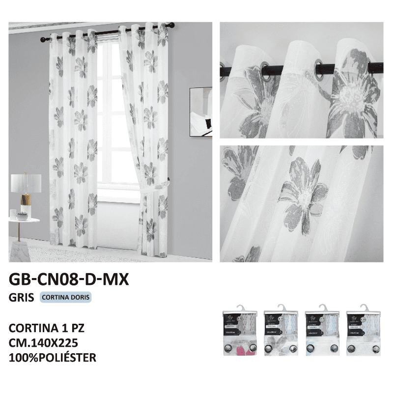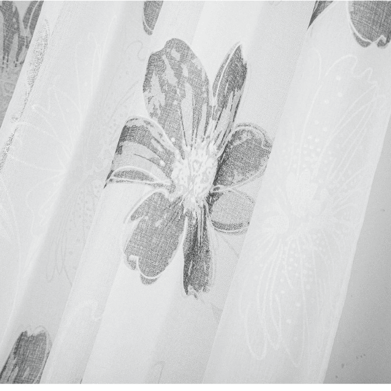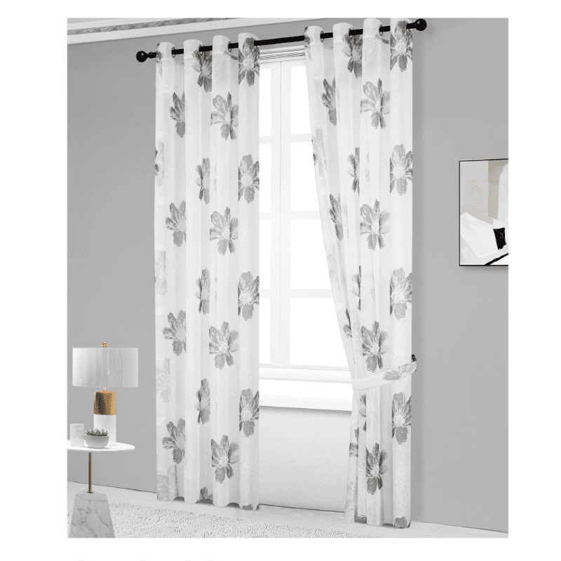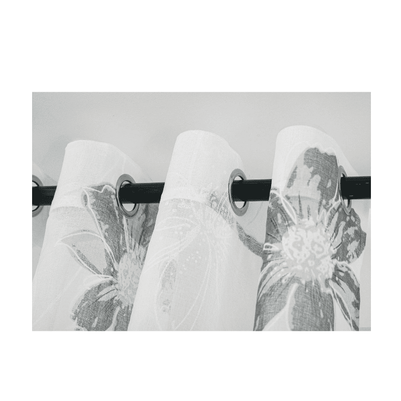Cortinas blancas con patrones florales y ollaos para barra. Diseño clásico y encantador que evoca naturaleza y frescura, regulando la luz con un estilo tradicional y acogedor.