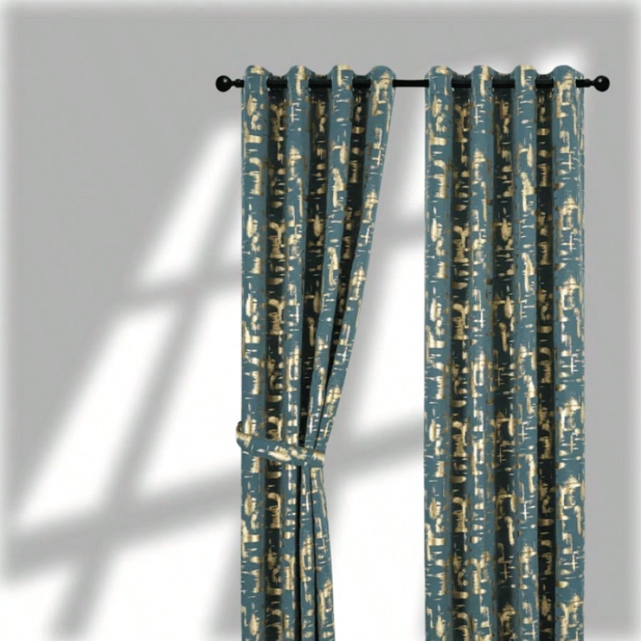 Cortinas verdes con detalles decorativos y sistema de ollaos. Combinan funcionalidad con diseño, añadiendo un toque de naturaleza y originalidad al control lumínico del espacio.