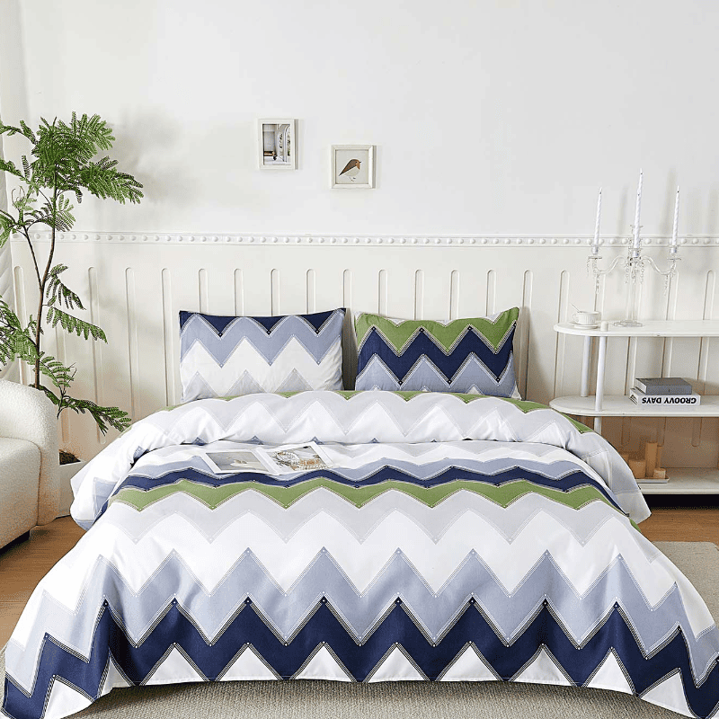 Funda nórdica con chevrón azul y blanco. Diseño geométrico contemporáneo que combina frescura y elegancia. Los tonos azules aportan serenidad creando un ambiente relajante y moderno para el descanso.