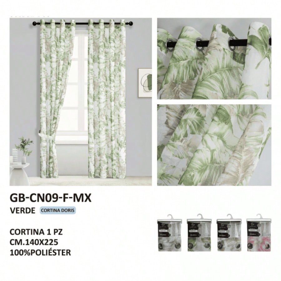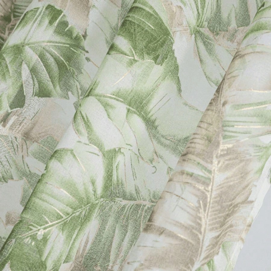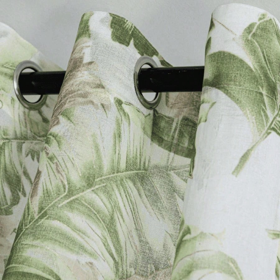 Cortinas blancas con detalles verdes y ollaos para barra. Combinación fresca y natural que evoca pureza y vitalidad, creando ambientes luminosos con toques de naturaleza en la regulación lumínica.