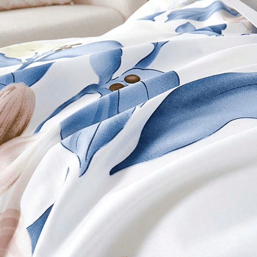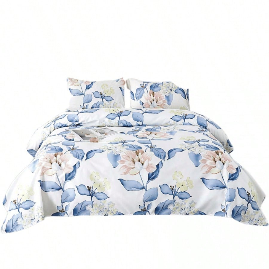 Funda nórdica con estampado floral en tonos azules. Combinación serena que une la belleza de las flores con la tranquilidad del azul, ideal para crear ambientes relajantes y armoniosos en el dormitorio.